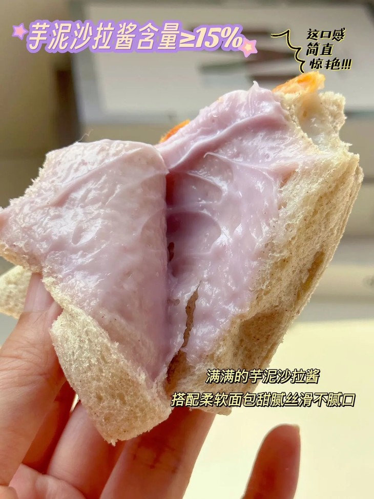 ≥15%的芋泥风味沙拉酱添加,肉眼可见的满满芋泥沙拉酱,厚厚一个三明治多层口感~根本抵抗不了