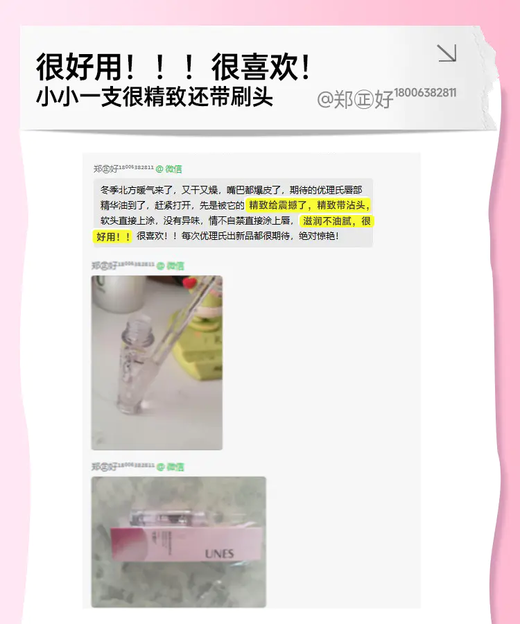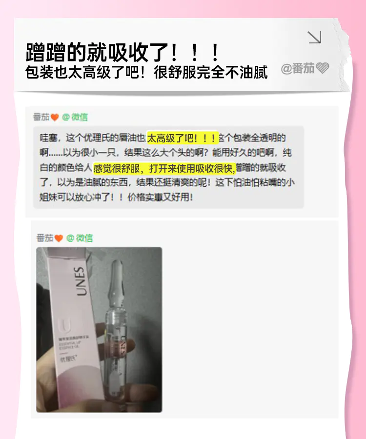 最开始都是对它的包装外观赞不绝口:精致高级🙈管身是透明的玻璃材质很有质感 里面的精华油 淡淡拿的粉色,整个很高级且非常有质感