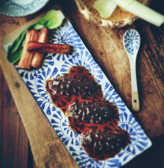 伟诗针对海参天性浓重的特点,采取“以浓攻浓”的做法,以浓味入其里,浓色表其外,达到色香味形四美俱全的效果。感兴趣的朋友,和我一起做吧!