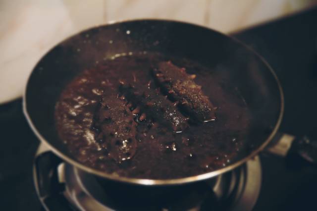 4、放入一勺料酒,两勺老抽,适量白糖,一小勺生抽,一小点薄芡,把汤汁收浓,出锅前放入一点香油;