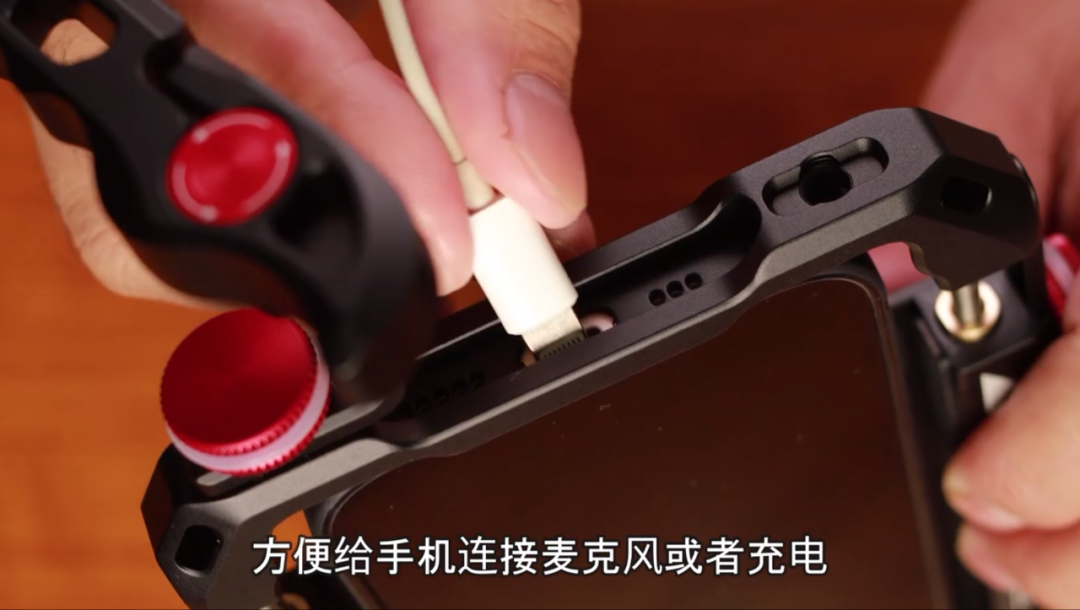 值得一提的是,兔笼右手柄的一侧有个开口,方便给手机连接麦克风或者充电。
