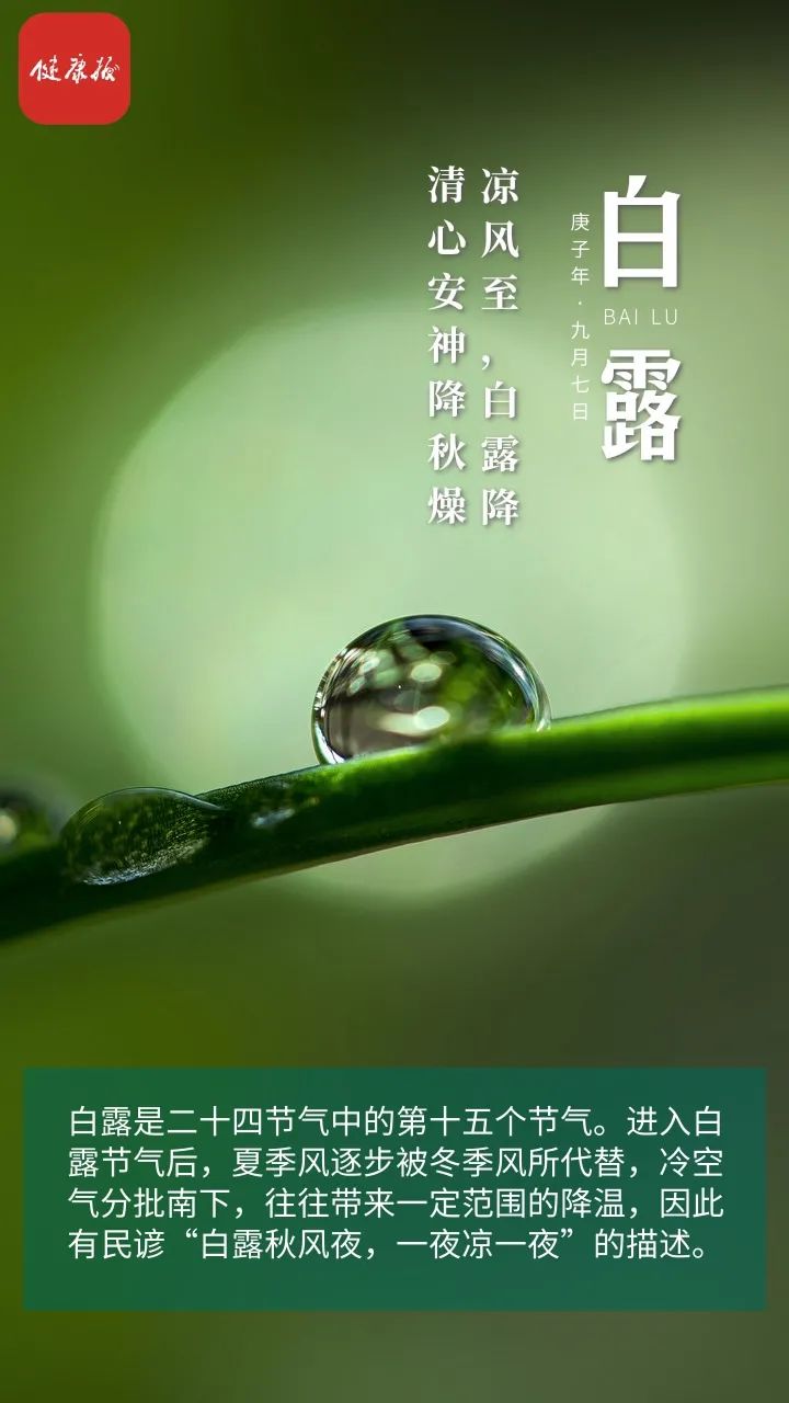 姐妹们,今天白露,是“二十四节气”中的第15个节气,秋季第3个节气,“白露”是反映自然界寒气增长的重要节气。由于天气逐渐转凉,白昼有阳光尚热,但傍晚后气温便很快下降,昼夜温差大,所以夜晚要多加注意,不要着凉。