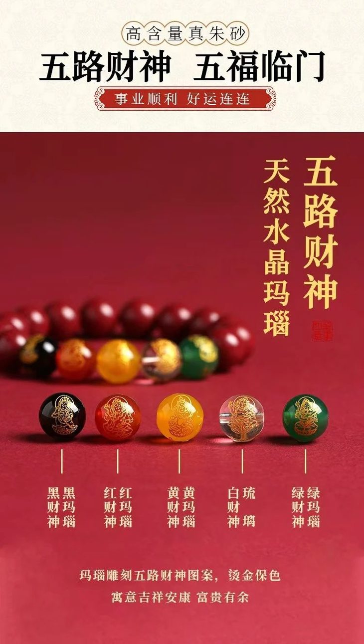 而这5款平安牌五色吊坠朱砂手串,五个颜色也是对应五路财*神。