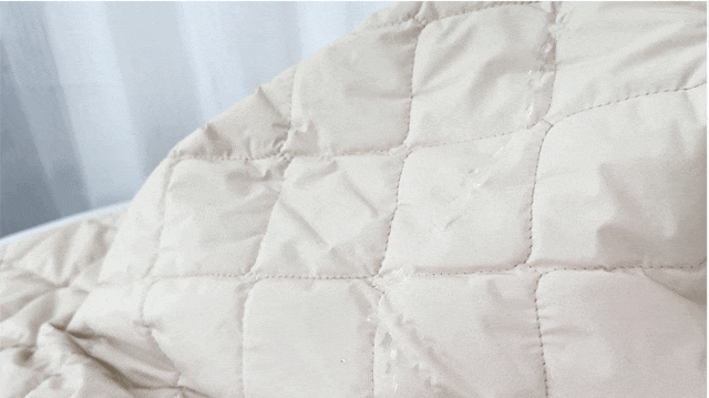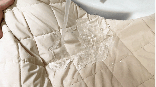 👉表层是仿荷叶超高疏水层,就像荷叶一样,会在表面形成斥水层,水泼洒上去会凝结成珠,从衣物上滑落。