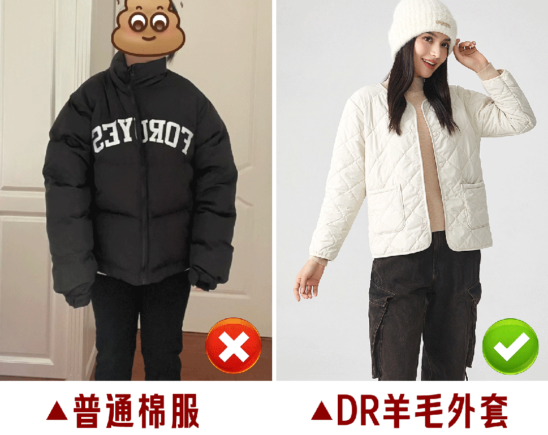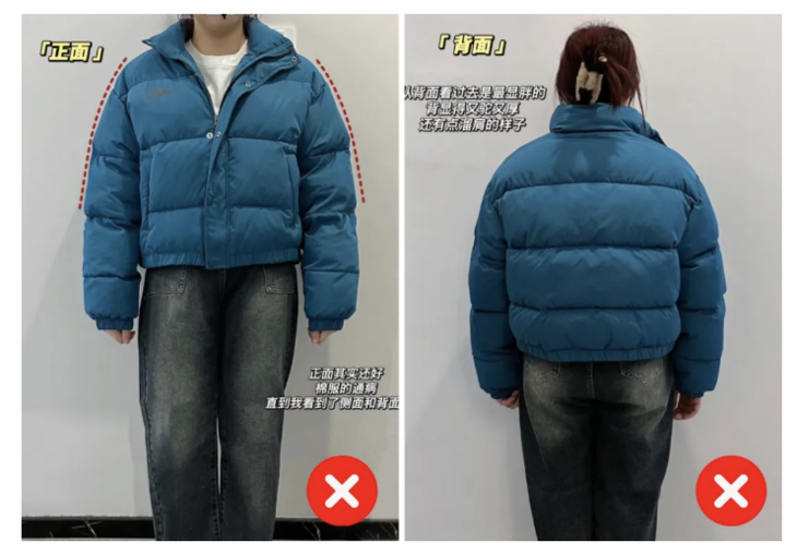 市面上一般保暖度可以的棉服外套都有一个致命缺点:穿上特别臃肿显壮,小个子穿上远远看起来简直像个“墩子”: