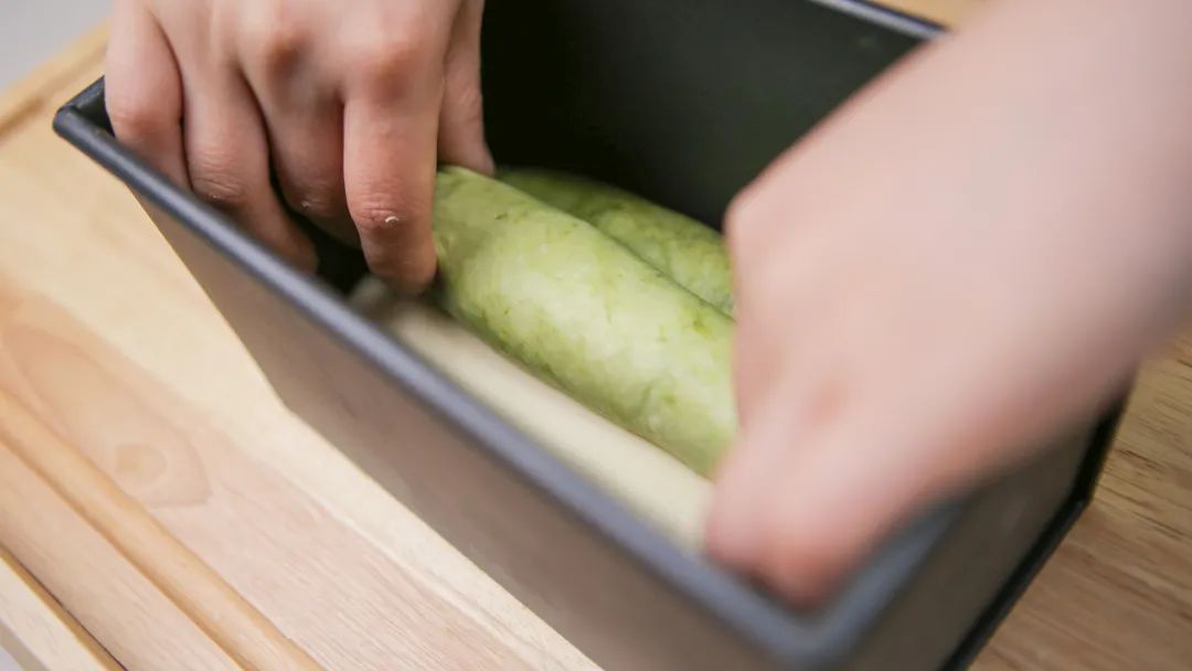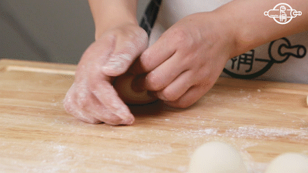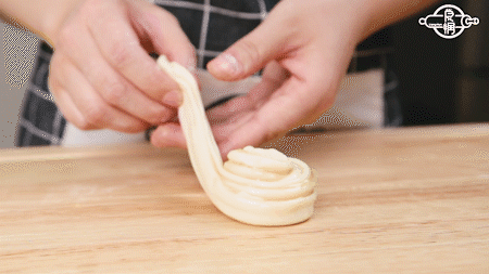 拉住两端,将长条状的面团拉长,然后从一端慢慢卷起,尾部收于底部