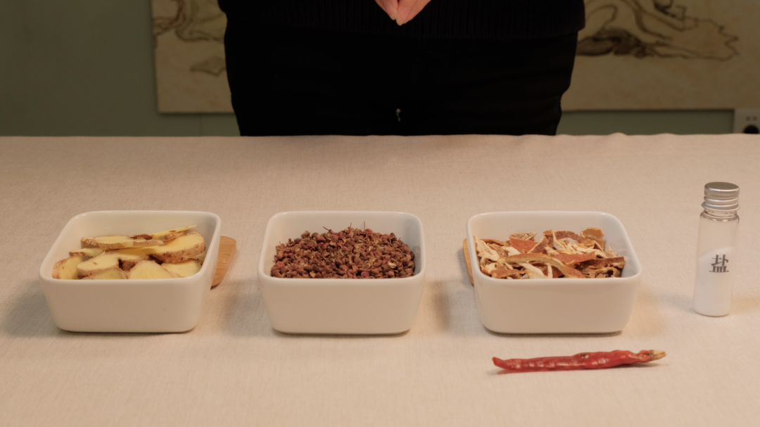 花椒少许、红干辣椒一个(冬天时将辣椒换成适量陈皮)、生姜三片、盐少许