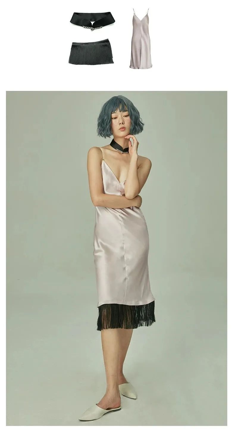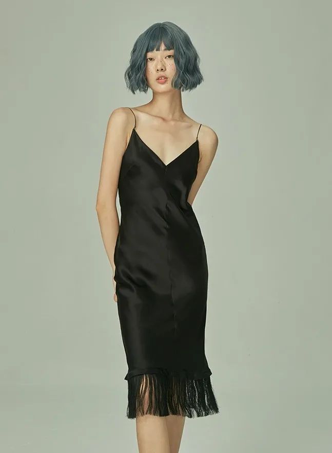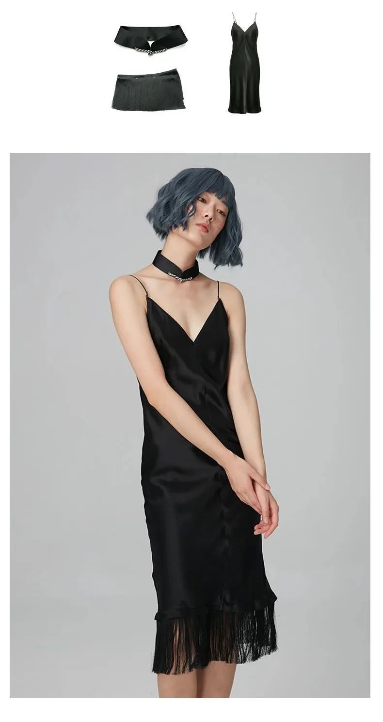 黑色睡裙+黑颈饰+黑流苏