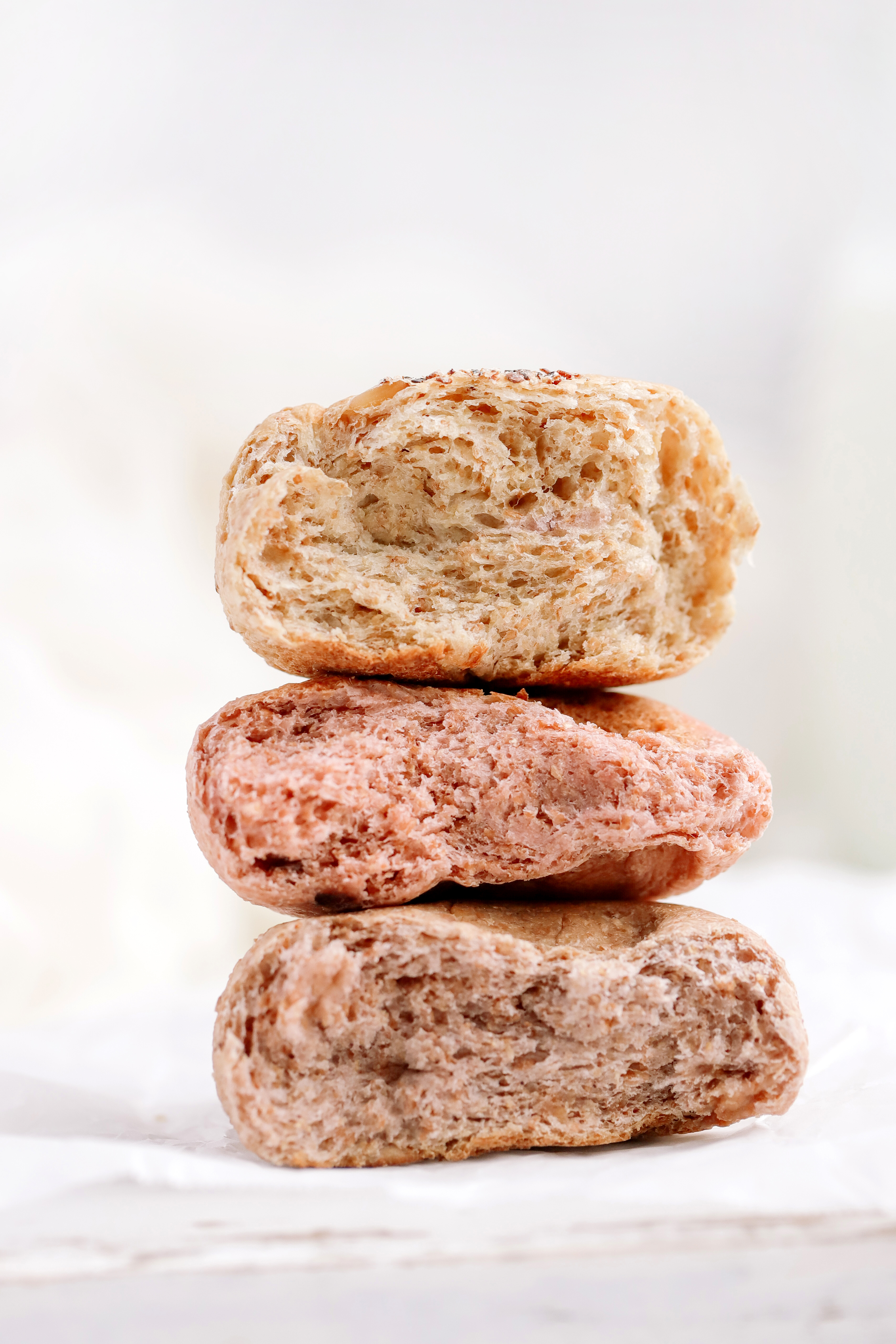 全麦粉和草莓粉充分融合后,醒发,焙烤。可爱的粉色面团再添进去几颗蔓越莓,自然清甜的香气,两种莓果相互搭着,好不妙哉。