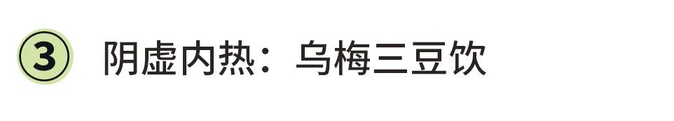 消积食,就少不了焦山楂,炒麦芽和炒莱菔子。这三个合用,不管宝宝是哪一类型的积食,都可以消。消完了积食再来清内热火气。要注意,这个火气要以疏通的方式散出去,不能像浇水那样熄灭,这个任务交给金银花。中医古书里记载“凡经络里结聚的壅热皆可清之”,宝宝积食的火气,主要堵在中焦经络,用金银花疏散这股热,刚好合适。另外的陈皮打通堵起来的中焦气机;冬瓜子化痰利水,清理因为积食产生的痰湿;还有茯苓,帮着给宝宝健健脾。宝宝积食的热,主要通过消积导滞,清理的方式解决。而阴虚的热,就要通过补的方式,把不够的津液填补上。填补津液,一道小甜汤就可以解决——乌梅三豆饮。它由乌梅白糖汤和扁鹊三豆饮复合而来,方子简单、好喝、又有效。乌梅三豆饮: