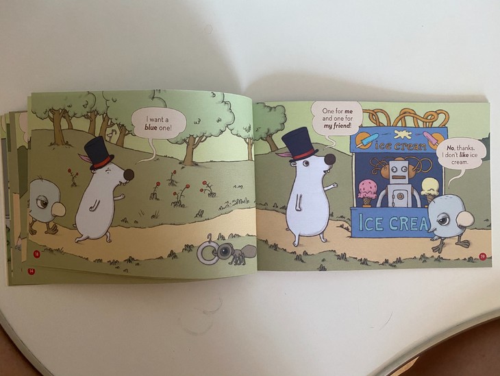 这个故事也有很有趣的地方,胖胖说他闻到了冰激凌的味道,贝利很冷淡的说“冰激凌还有味道?”以及胖胖给贝利也要了冰激凌,贝利嘴上说着不喜欢,但是最后吃的直舔嘴。