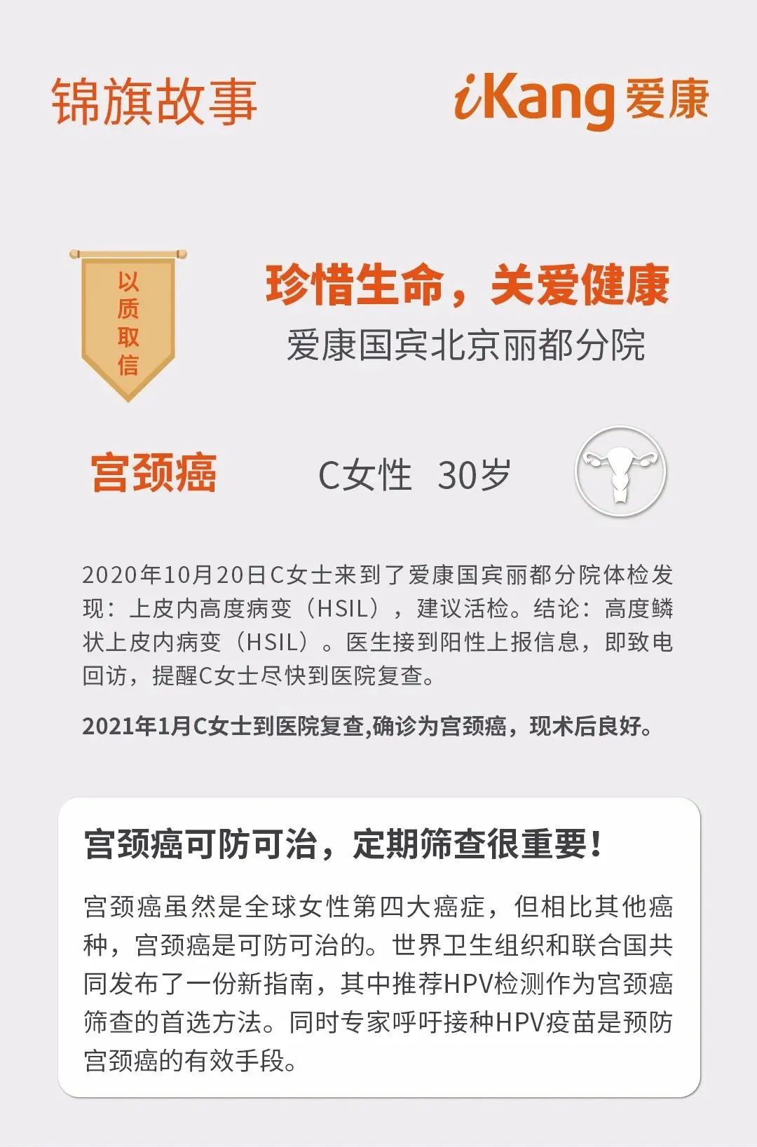 妇科主任体检当日给C女士检查后就跟她说:等看妇科采样结果情况到医院就诊,客服大夫接到阳性上报信息,即给客户致电回访,请客户到医院复查,2021年1月客户到中日医院复查,确诊为宫颈癌。现术后良好。
