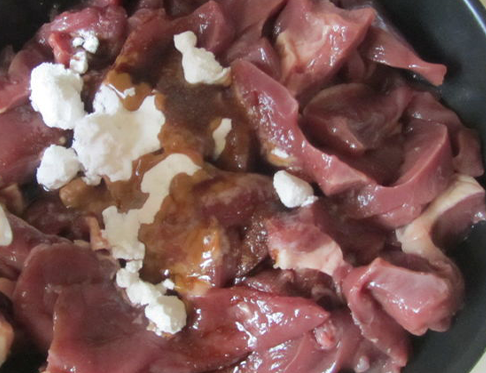 2、猪心捞出来挤干水份,加入1小捏盐,1勺料酒,用手抓匀,再加入1平勺玉米淀粉抓匀;