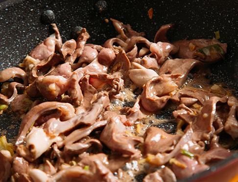 1、锅烧得特别热,倒入1碗油(吃饭小碗),待油微微起烟后关火,把猪心放入锅里,过一会儿油起泡了,这时晃一下锅,如果没粘,把火打开,用筷子轻轻把猪心推散,猪心变白后把猪心捞出来;