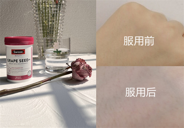 现在,咱们先来看看美白产品,我是用【Swisse葡萄籽烟酰胺胶囊】,在使用过程中肉眼可见的皮肤有好转,内服这一块,妥妥拿捏住!!