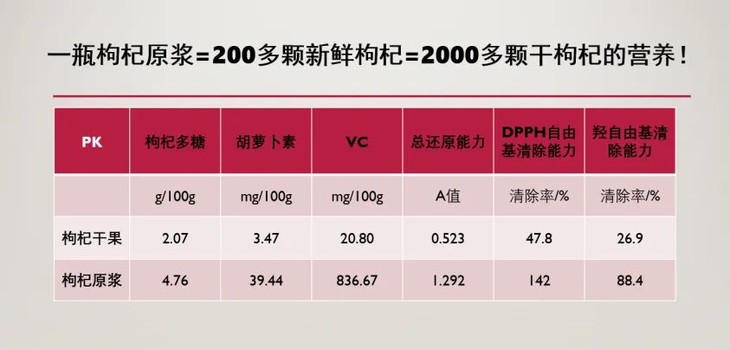 而以枸杞鲜果为原料,经加工制成的枸杞原浆,能很大程度上避免干燥或熏制等加工方式所导致的营养成分流失和污染,且与传统枸杞泡水或泡酒等方式相比,可更充分地保留枸杞原有的营养成分,故而自问世以来便备受大众青睐。
