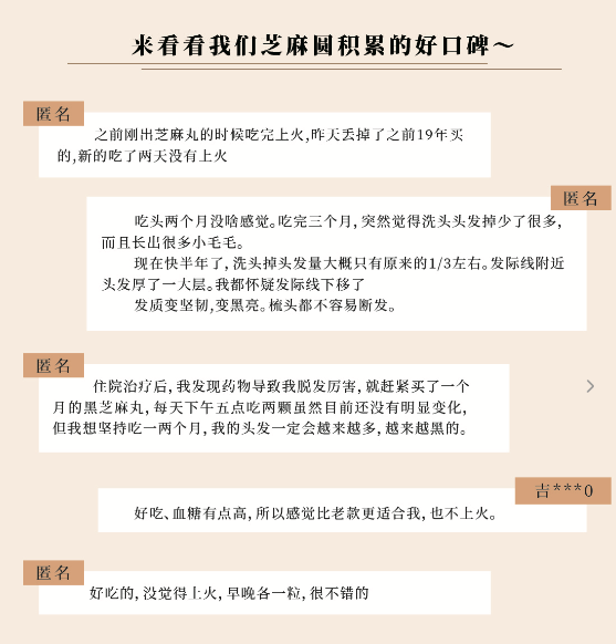 那为什么要选择芝麻圆这款产品来赠送养生咨询的服务呢?首先是黑芝麻几乎所有人都适用的,也被大部分吃过觉得有效果的伙伴们称为“长命百岁丸”!