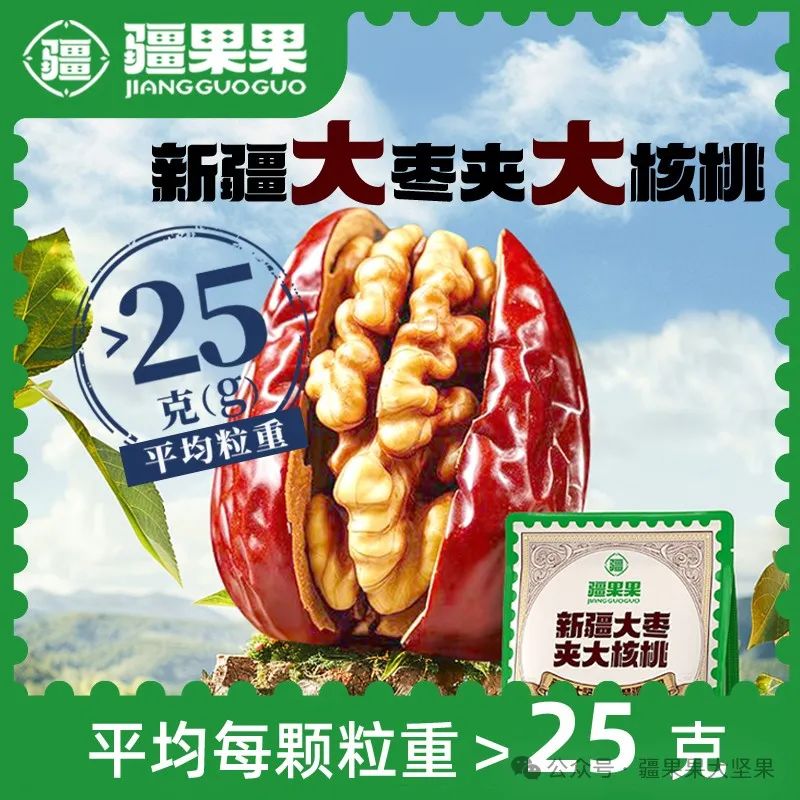 新疆大枣夹大核桃:大枣选自新疆红枣核心产区——和田策勒县,核桃选自中国核桃之乡——阿克苏温宿县。平均每粒克重>25g,1个疆果果大枣夹大核桃=1颗大玉枣+3颗(核桃半仁),每一个都是真空独立包装。