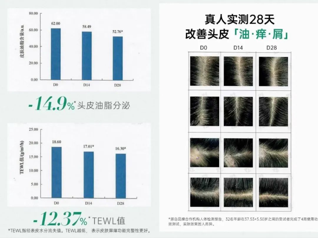 品牌方还参加了第三方检测机构28天仪器检测和真人实测,修护头皮屏障的效果看得见!