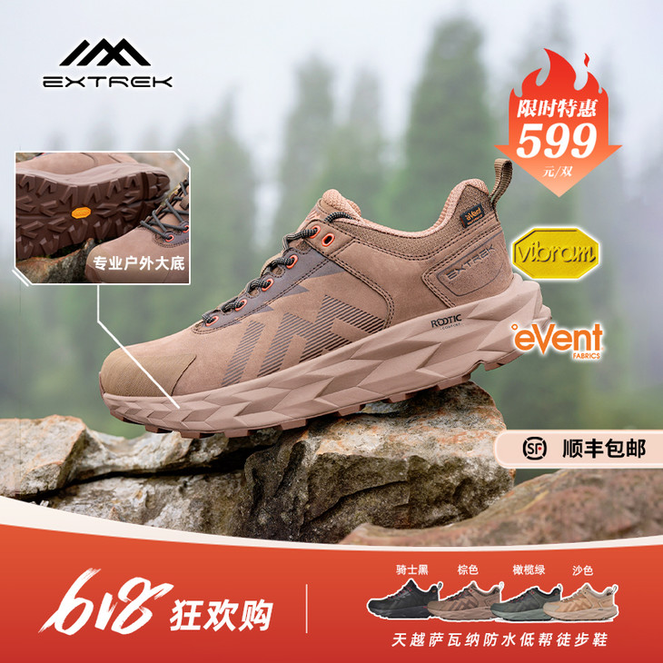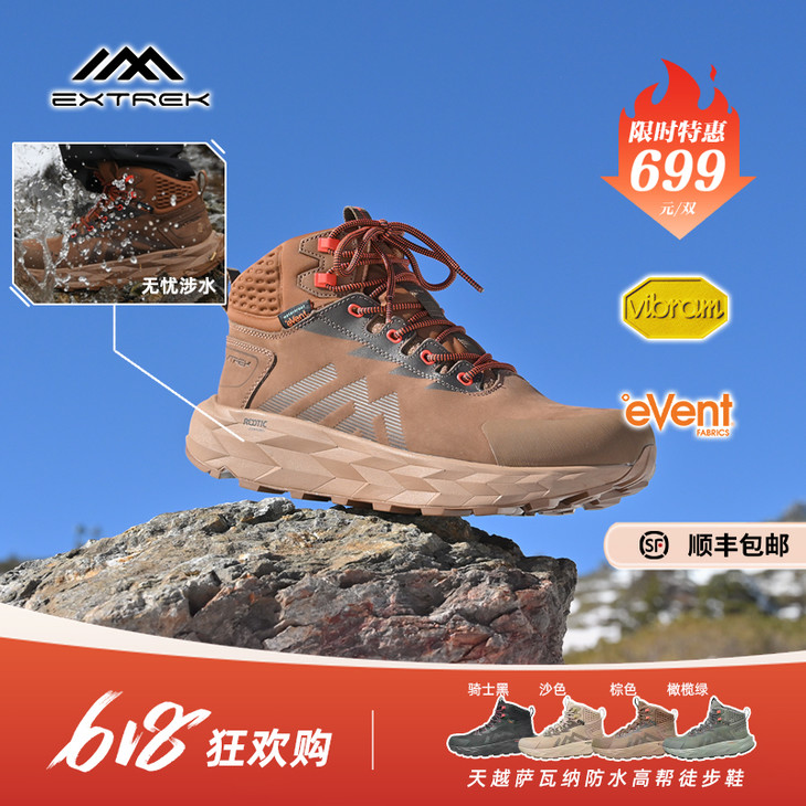 推荐理由: Event顶级防水+头层牛巴戈鞋面,防雨雪。VIBRAM大底、Rootic减震中底,不累脚。CoolMax内衬、德国Basf泡棉鞋垫、瑞士Sanitized抗菌,速干防臭!