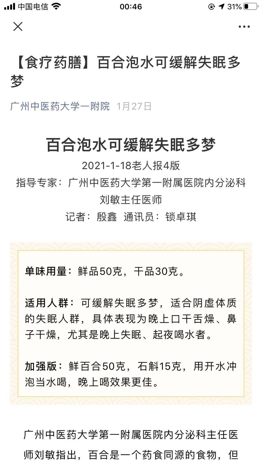 为了治失眠,中西医我看了不少,也没什么效果。去年10月一次偶然的机会,我在一张旧报纸上看到一篇介绍百合治失眠的文章。上面说,从中医角度看,百合入心经,性微寒,能清心除烦,宁心安神,可用于热病后余热未消、神思恍惚、失眠多梦、心情抑郁等症;凡是睡眠不安、易醒、多梦、易惊者,睡前均可饮百合汤。但具体该怎么服用,文中没有介绍。