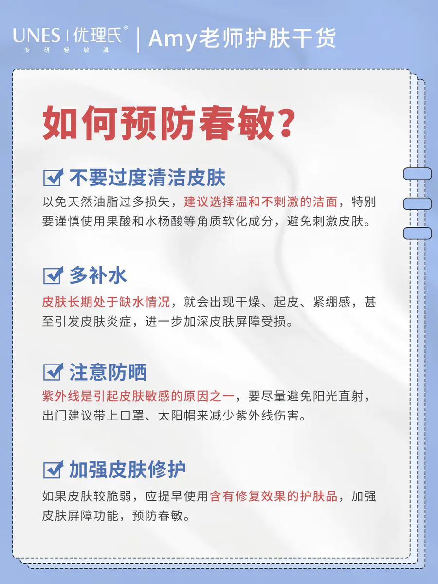 春天面部肌肤变得时干时油,容易脱屑,使皮肤屏障遭到破环,导致平时用惯的护肤品也会出现过敏反应。