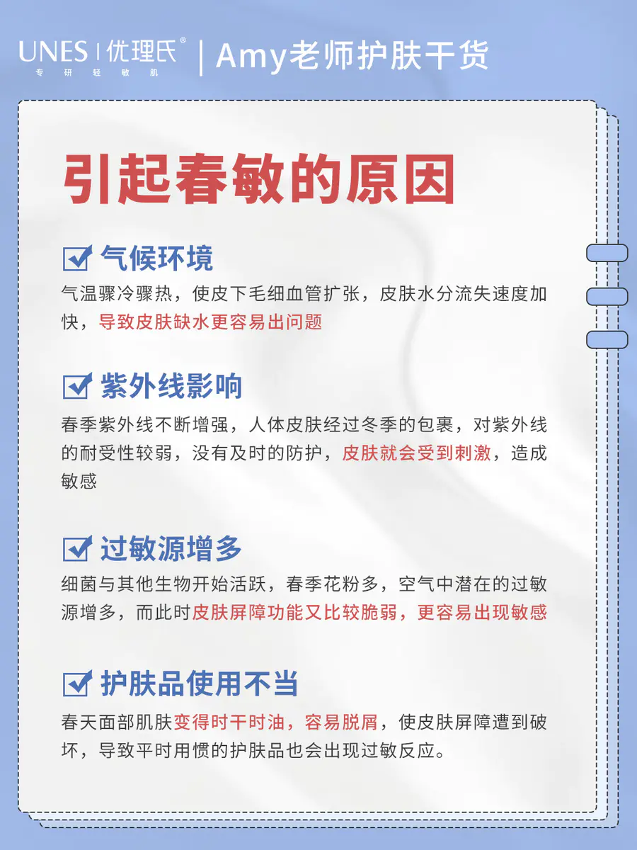 在季节交替的过程中气温回升较快冷暖空气又频繁交流,同时细菌滋生紫外线变强、风变大等因素;皮肤还不能正常适应这种变化,皮肤屏障功能也会相对减弱,所以容易在春季出现各种肌肤问题,这就是春敏。