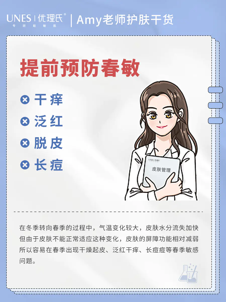 冬天和春天交替时,气温会有剧烈波动,热时使毛细血管扩张,皮肤水分流失快,冷时机体为了维持供血和体温,也会扩展,导致皮肤缺水更容易出问题,造成皮肤过敏的状态。