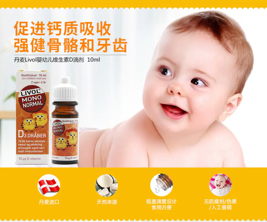 Livol,丹麦本土品牌,源自1️⃣9️⃣5️⃣9️⃣年北欧!专为哺乳期宝宝🏻设计,10毫升/瓶,无糖无味,一天5滴-400IU满足每日所需!直接将瓶子倒过来,滴5滴就可以了。哺乳期的宝宝,妈妈们可以试着滴在乳头上或干净的奶嘴、手指上,让娃至少吸吮30秒。12月至2岁的儿童,可以滴在勺子上,伴入牛奶🥛果汁🍹或其他食物内中一起服用。