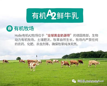 Holle有机A2奶粉的奶源精选自德国阿尔卑斯山脉地区、世界级黄金有机奶源地,生物动力有机牧场,牧场不许使用任何的农药,化肥,杀虫剂等,确保牧草纯净天然。