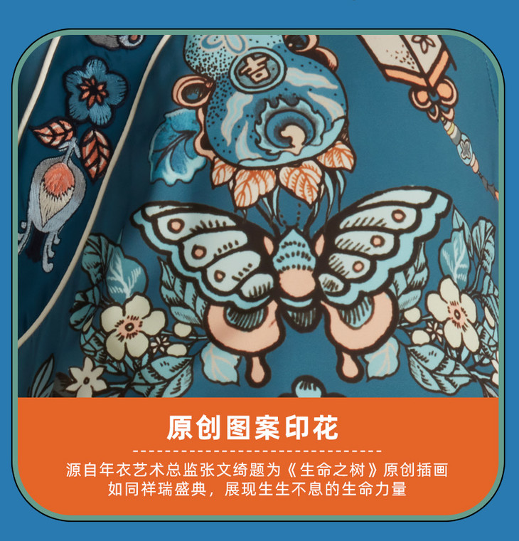 印花来自年衣创始人张文绮作品生命之树,不仅时髦,而且有着浓厚的京味文化,身上有着寓意美好且有生命力量的图案,蝙蝠、蝴蝶、凤凰、石榴、葫芦、莲荷,无一不是我们极具代表性的民族符号