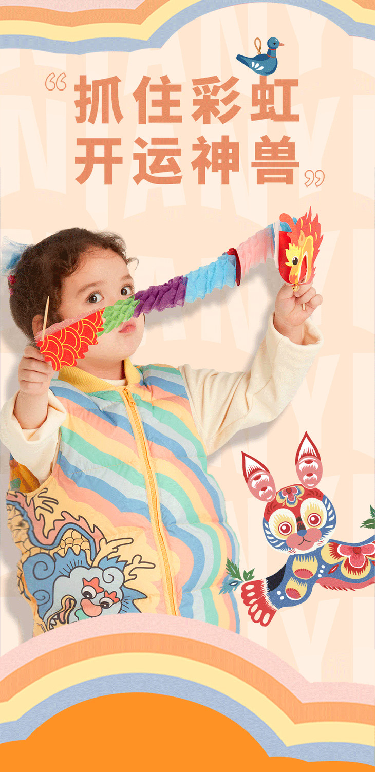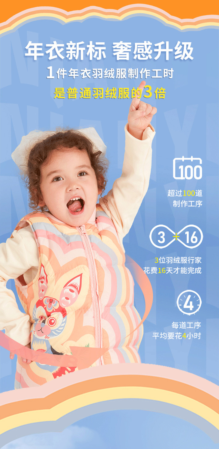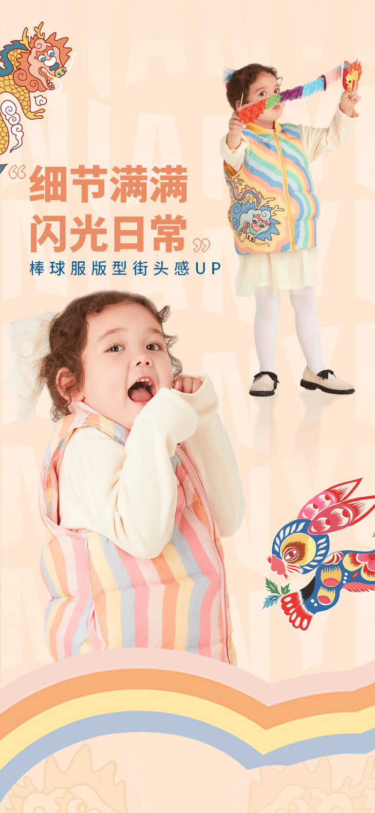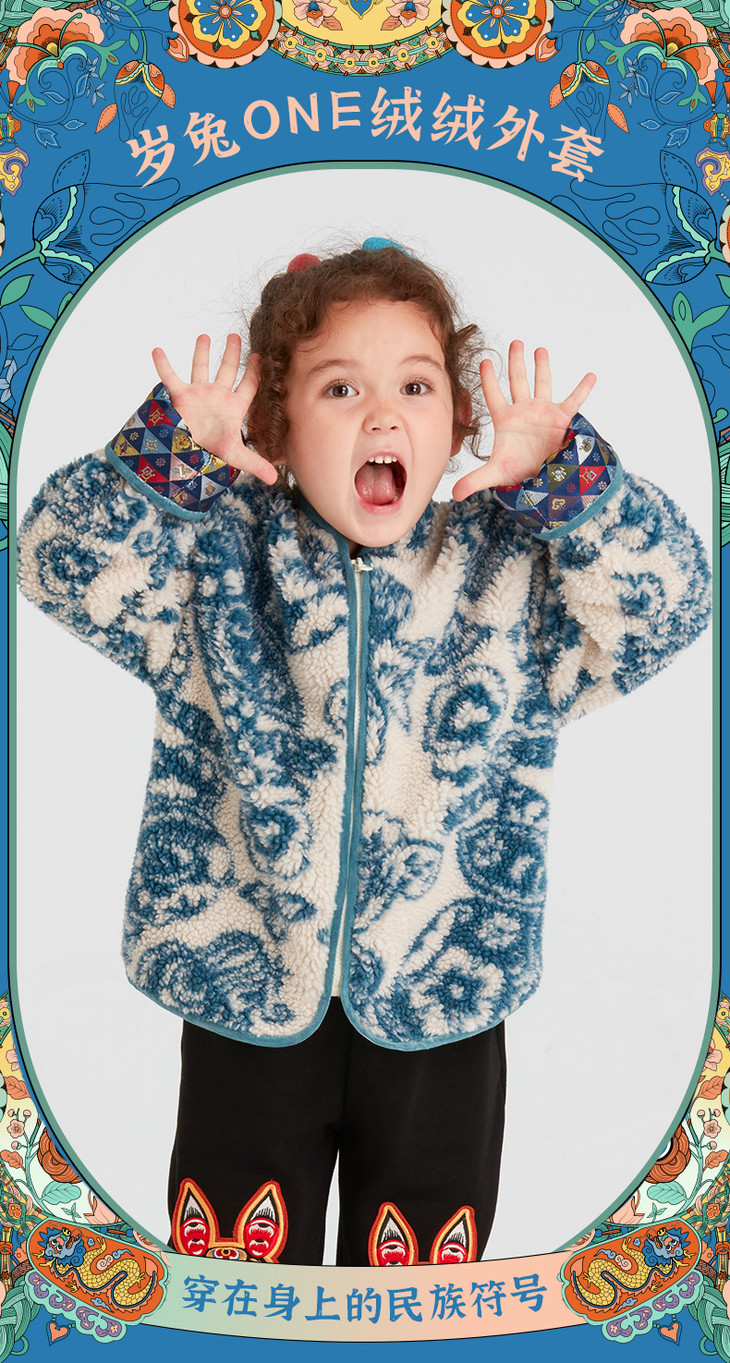 年衣的设计感很贴合中国人的传统和仪式感:图案彰显吉祥之气,承载着福禄双全的美好祝愿。这种中国传统气韵,拿捏的恰到好处。轻松快乐的时尚感也真心是来自孩子视角的时尚设计。将国风元素和时尚感融合得非常的到位。