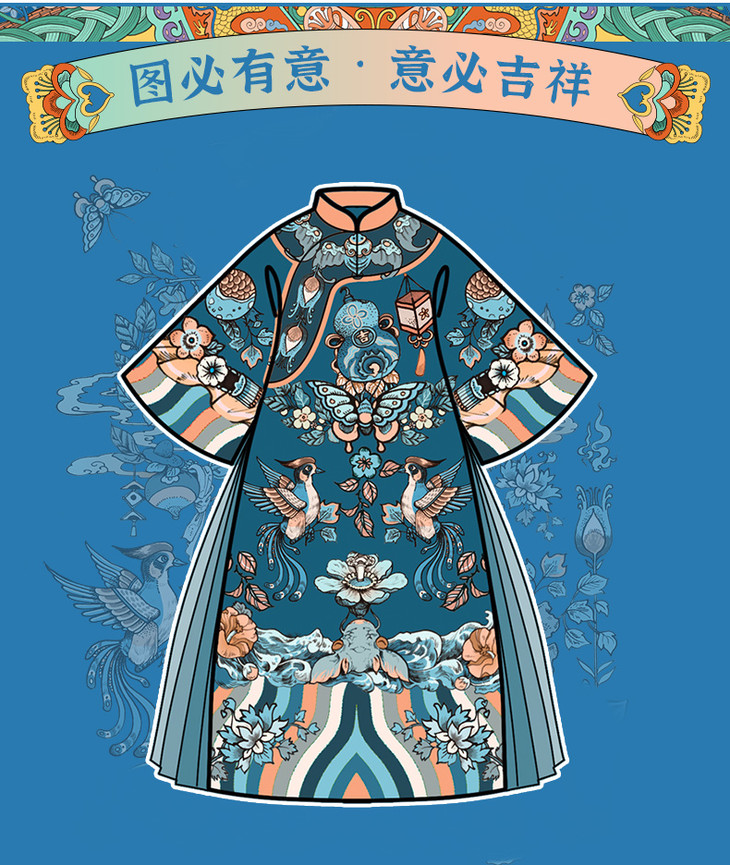 光感缎面,平整而且有光泽,舒适垂顺,下摆加密网,步孔清晰,手感挺爽,富有弹性,透气性好,古代经典的御用配色,吉祥精美印花图案,华贵中又有一丝俏皮,打造主题场景,色彩靓丽,一衣多穿,既端庄又时髦。