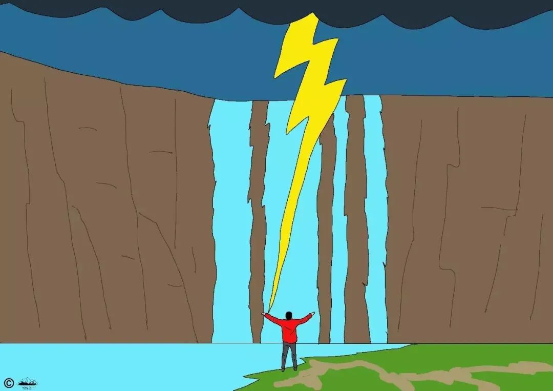 由于岩石不是很好的导电体,如果闪电击中山体高处,巨大的电流需要寻找别的导体通向地面。当你在悬崖下洞穴中避雨时,闪电会选择你的身体作为通往地面的“道路”。
