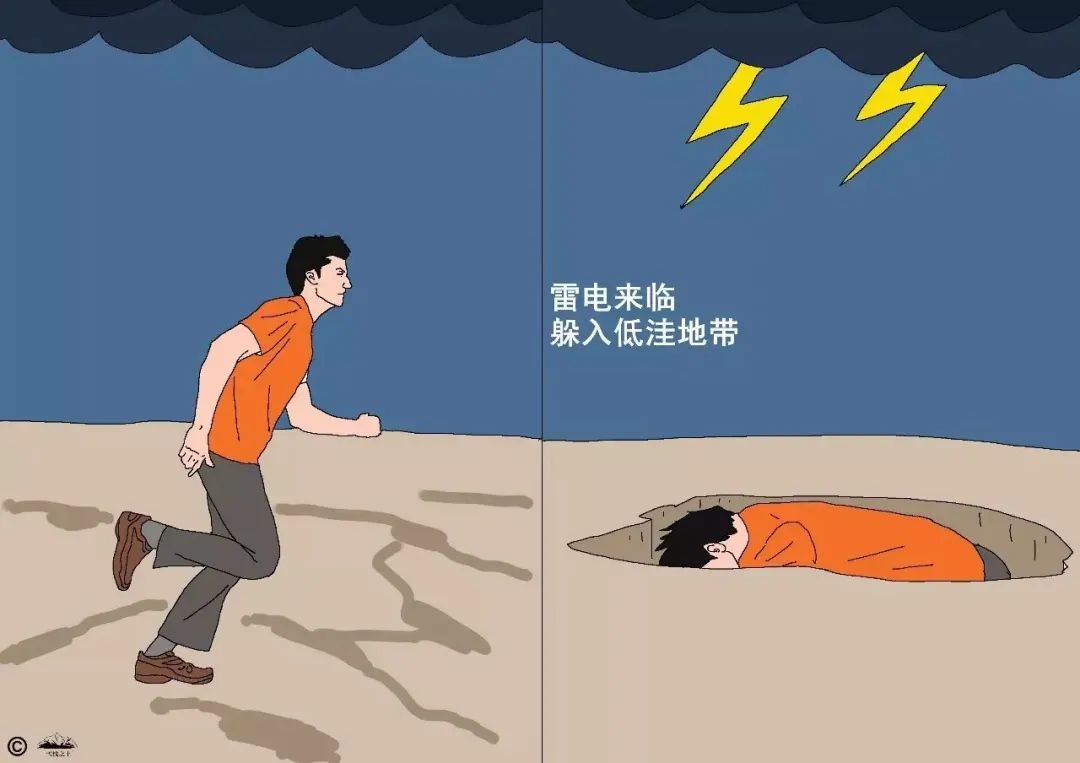 闪电喜欢击中制高点,因此跑入低洼地带可以带来安全。如果雷暴突至,你处于毫无遮蔽的山区,一定要立刻放弃向上攀登,尽快寻找低洼地带躲避。