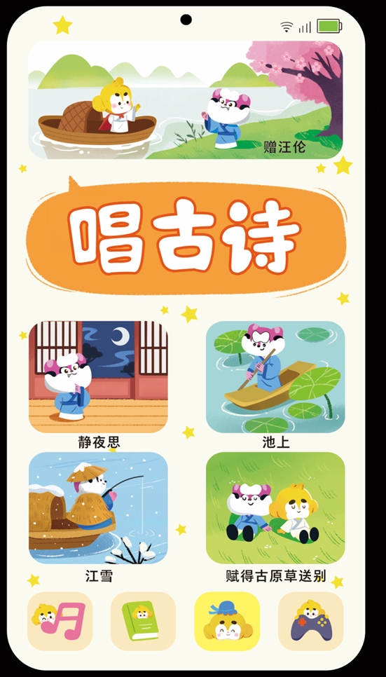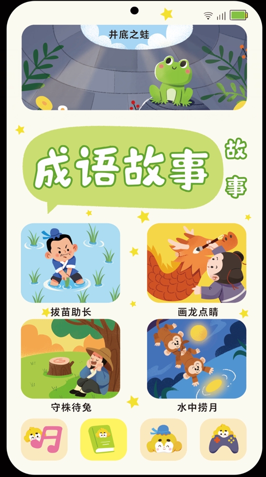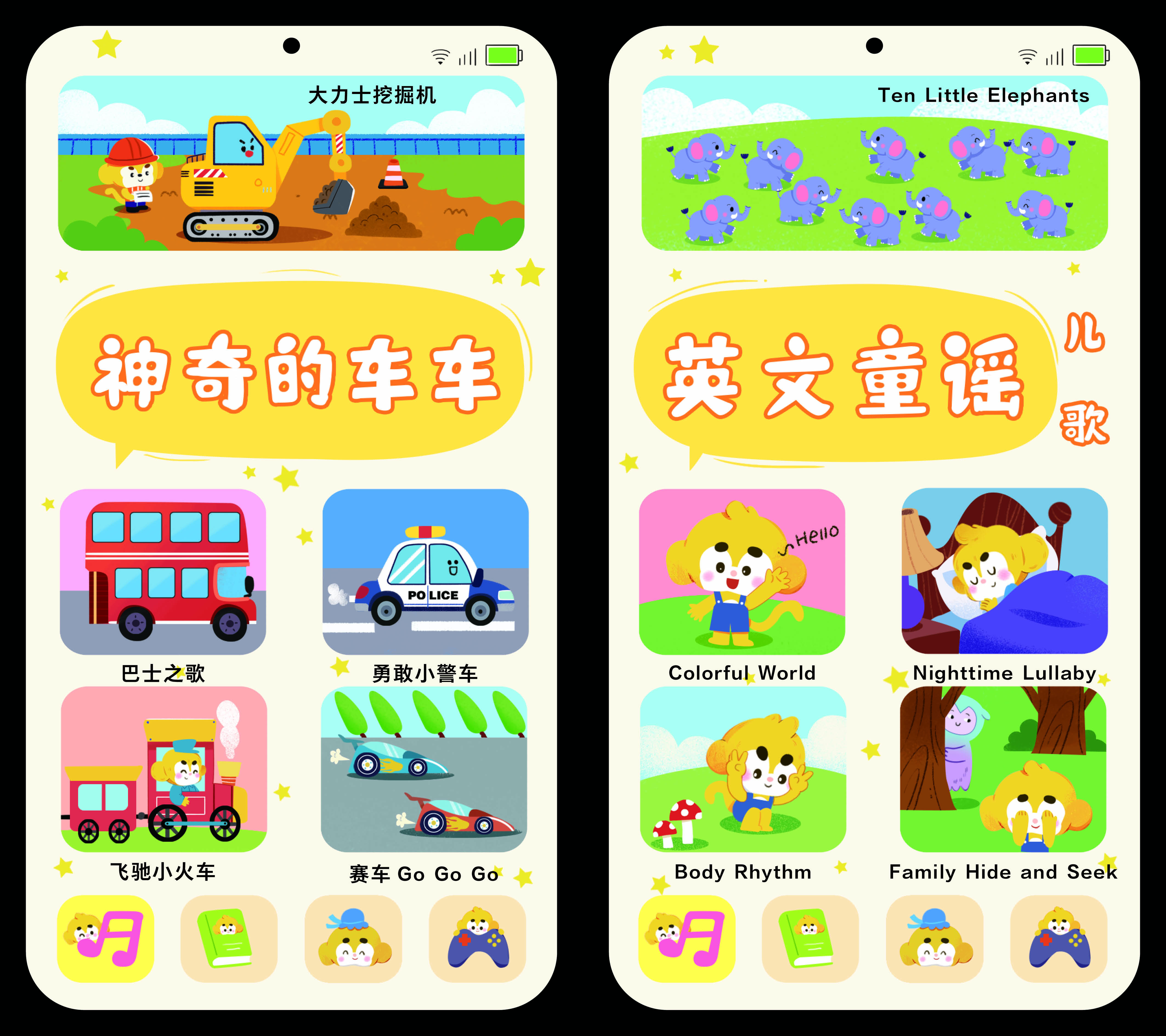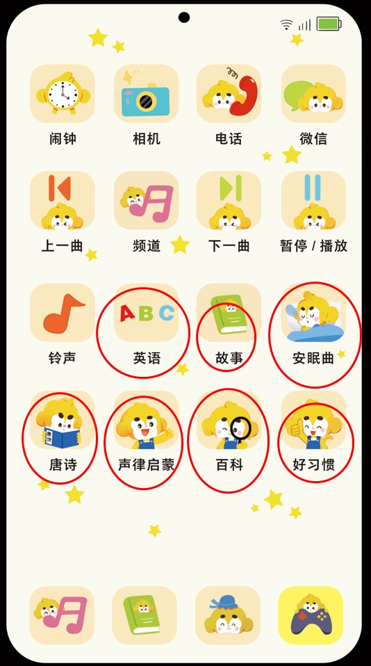 打开手机,里面有大量听得素材,有儿歌、科普故事、绘本、国学、一个点击演奏的电子琴和一个界面丰富的功能手机屏。
