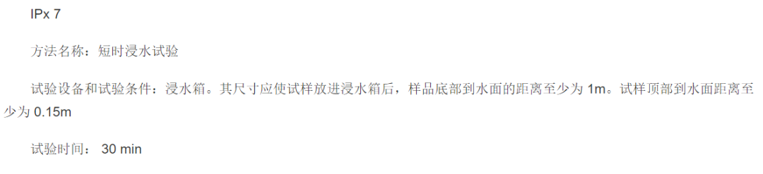 之前有人问过防水等级怎么看,IPX防水等级一共分为0-8级,7级就代表可以短时耐浸水。