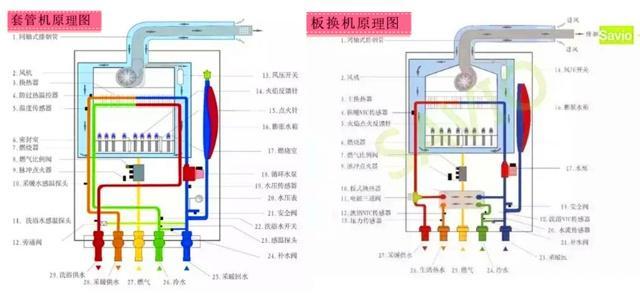 目前市面上的壁挂炉产品按照换热方式可分为套管机和板换机。套管机由于一次高温水没有流动,在水压底或水压不稳定的情况下短时关闭龙头再打开时生活热水会出现少许的水温浮动现象。而板换机一次高温水始终流动,且换热由二次板换完成,在采暖和生活热水供应上都更稳定和更舒适。