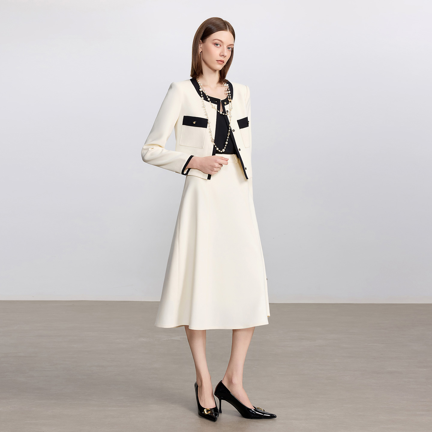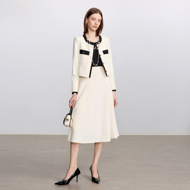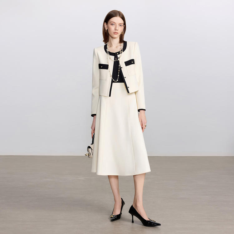 当经典小香风邂逅职场正装,便诞生了这款黑白拼接的西装外套半裙两件套,为秋冬职场的名媛们打造出兼具优雅与专业的穿搭范本。