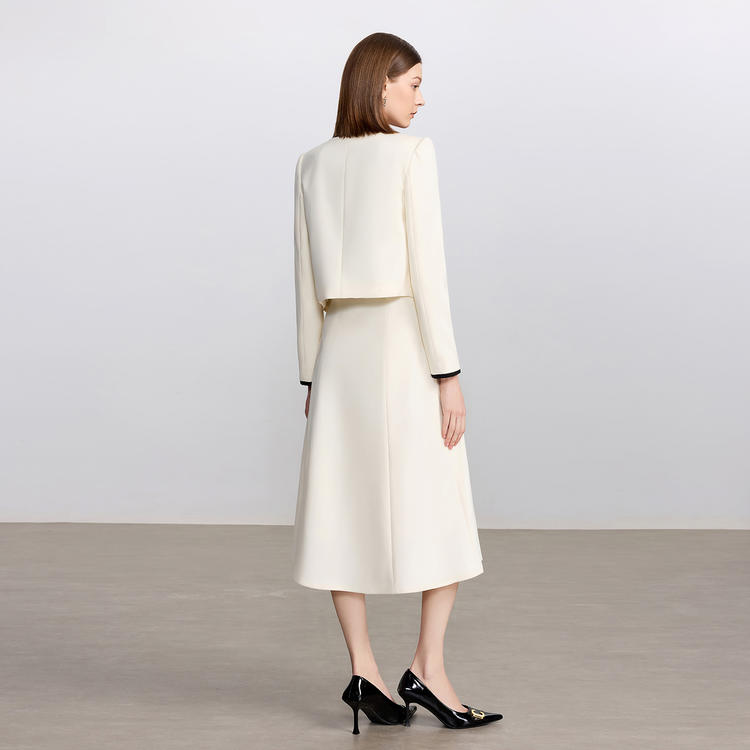 下装的半裙是大 A 摆中长款设计,米白色的裙身垂坠感极佳,行走间摇曳生姿,既能修饰腿型,又为整体造型增添了几分柔美。
