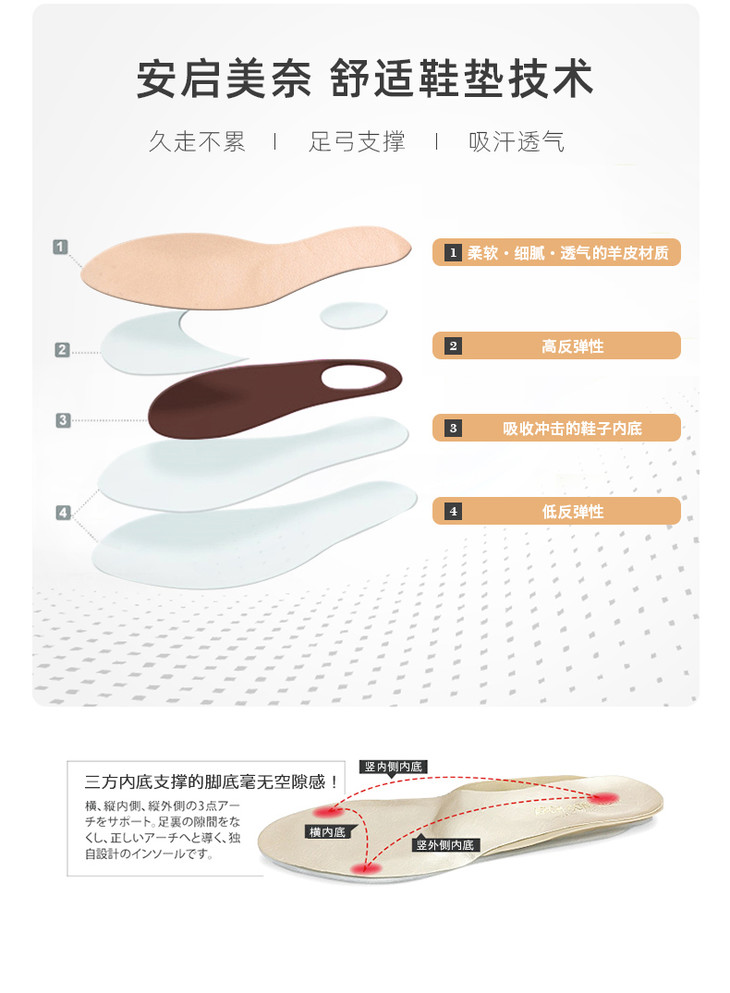 听说过安启美奈的,想必都知道他们的鞋子是以舒适而出名,独特的鞋楦设计,以及足弓支撑鞋垫,穿出堪比运动鞋的效果👍👍👍