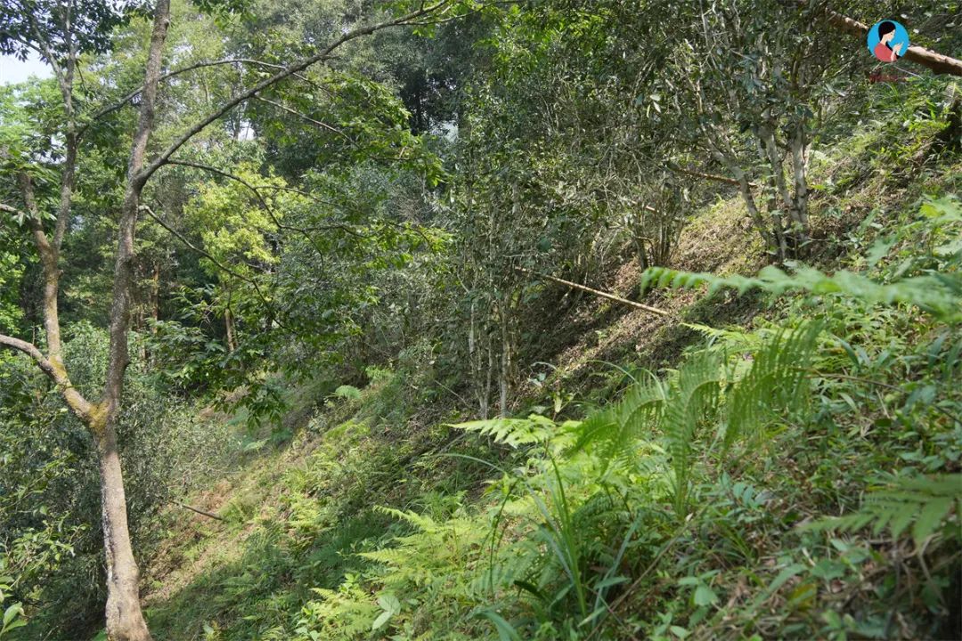 茶树分散在山坡的腰上和脚下,坡脚茶王树河流淌而过。海拔从坡头、坡腰到坡脚有300米左右的落差,其中坡腰这一段的海拔在1300米左右。