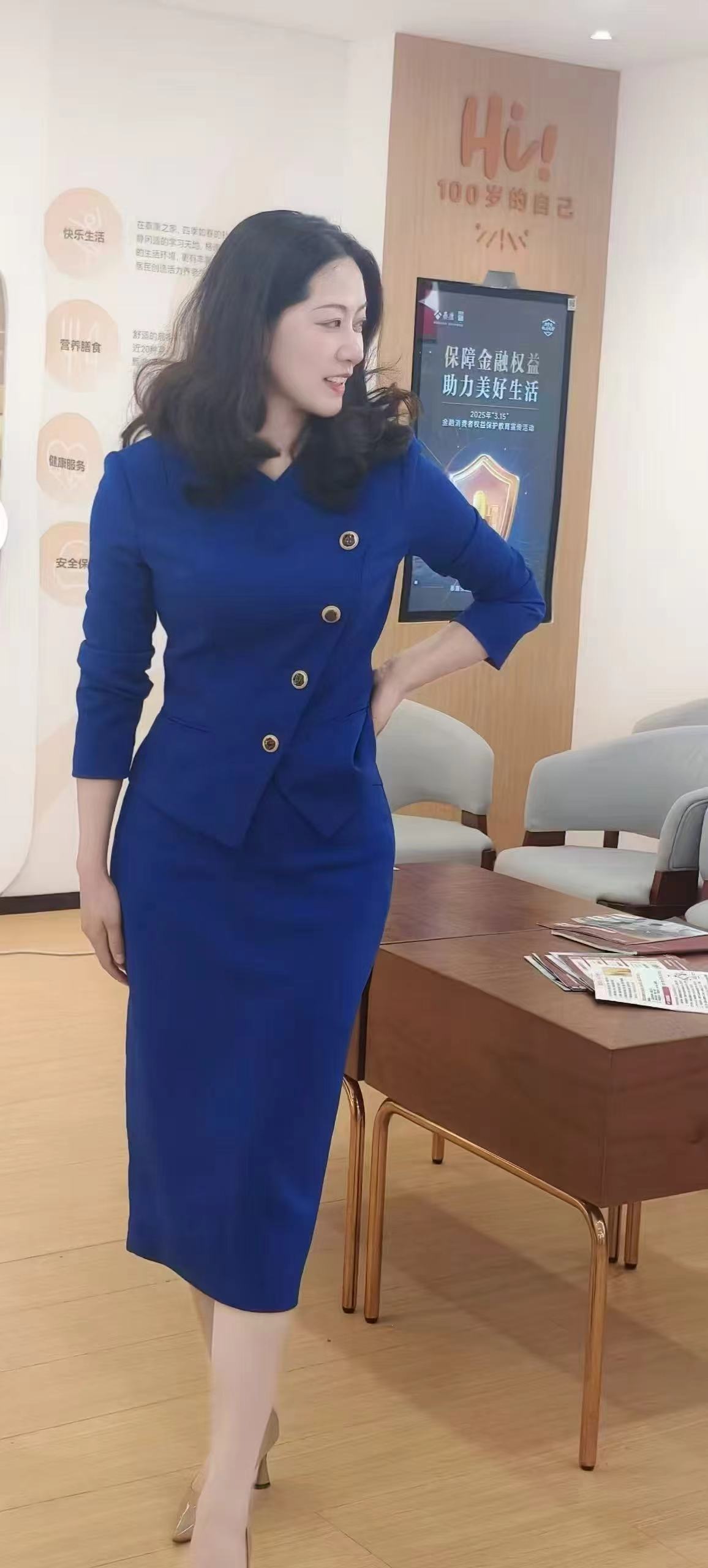 估计很多姐妹都是被这张买家秀种草的吧,这位客户是前凤凰卫视的主持人,穿了我们家克莱因蓝空姐套裙,还特意给我们发来好评