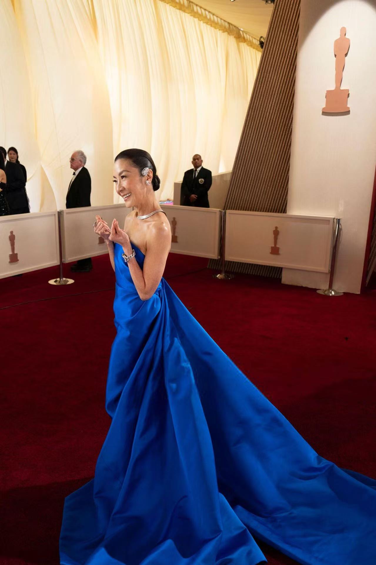 这是武打巨星杨紫琼穿克莱因蓝的照片,他本身就是一个黄黑皮,但是穿起来也是一点违和感都没有,并且特别出彩