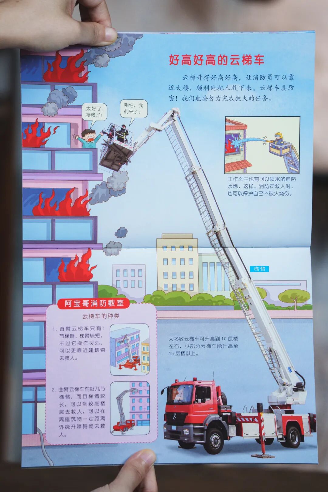 还有超大竖版跨页图,专门给孩子科普云梯车的种类。