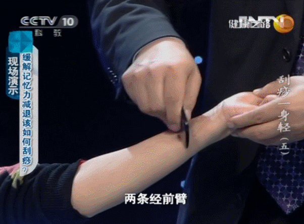 👉第三步:刮拭手臂上的心经和心包经,从上往下刮,可在内关、神门处重点刮拭 (点按揉)。左边刮完,刮右边。