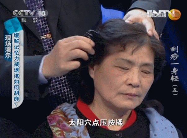 👉第二步:先在太阳穴处点压、按揉,然后刮至风池穴,在风池穴处从上往下刮。左边刮完,刮右边。