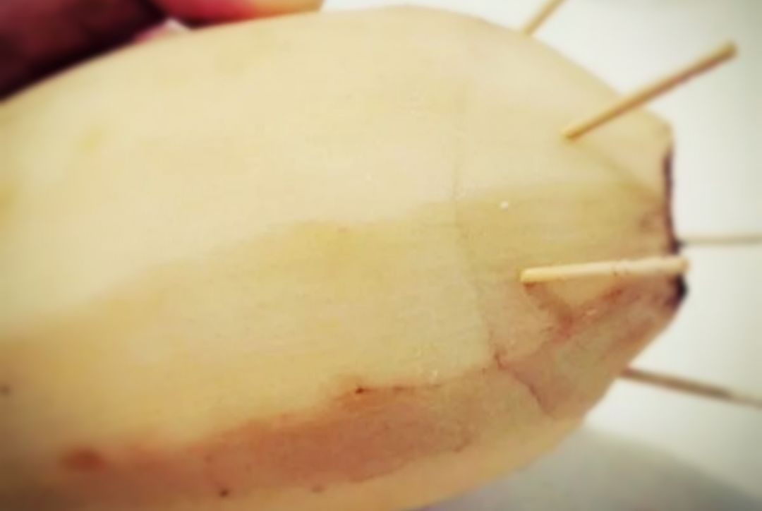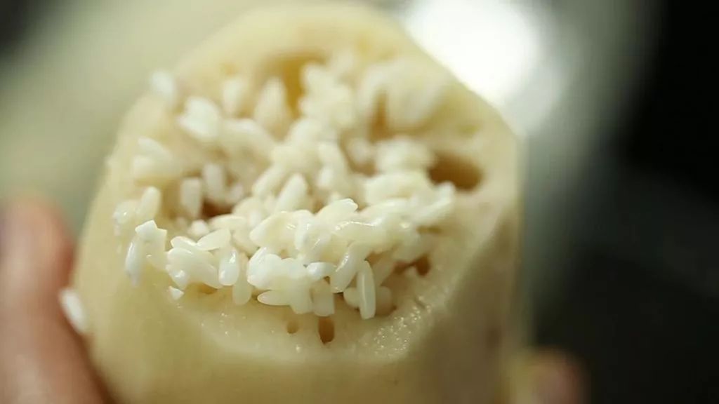 2、将泡好的糯米填入莲藕孔中,可用筷子轻扎使之填满,注意不能太用力以防将莲藕孔戳破;