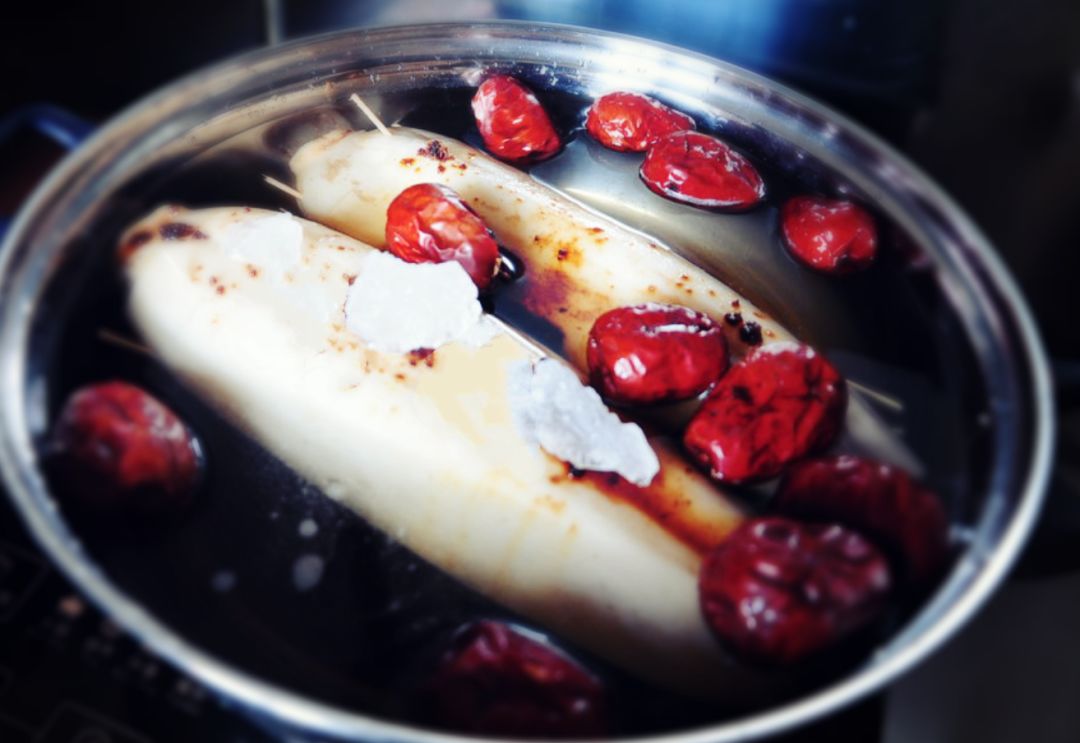 4、莲藕入锅,水量要能没过莲藕,放入6两冰糖,1斤金丝小枣(若是大枣放半斤);