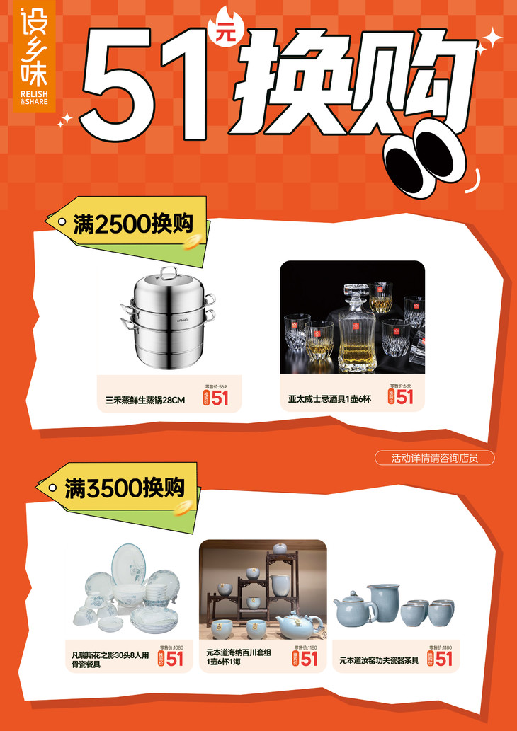 满额换购(51元大礼包等您带回家)全场消费满500元、1500元、2500、3500元+“51元”换购惊喜礼包。